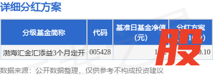 本站消息,6月18日发布《渤海汇金汇添益3个月定期开放债券型发起式证券投资基金分红公告》。本次分红为2025年度的第1次分红。公告显示,本次分红的收益分配基准日为6月6日维嘉优配,详细分红方案如下: